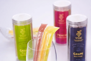 岡山のフルーツとマリンコラーゲンペプチドを配合したスティックゼリーは冷やしても凍らせても美味しくいただけます。かわいいデザインで、季節を問わずフルーツの味を手軽に楽しめるスティックゼリーはお土産に人気の商品です。