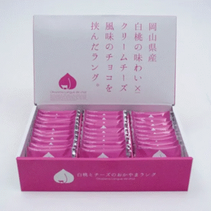 ネットショプでも売上上位にランクインする定番の個包装お土産。岡山県産白桃とクリームチーズのチョコレートを蒜山高原のジャージー牛乳を練り込んだ生地でサンドした「おかやまラング」はピンクのお箱も目を引きます。10枚入り、30枚入りがあります。